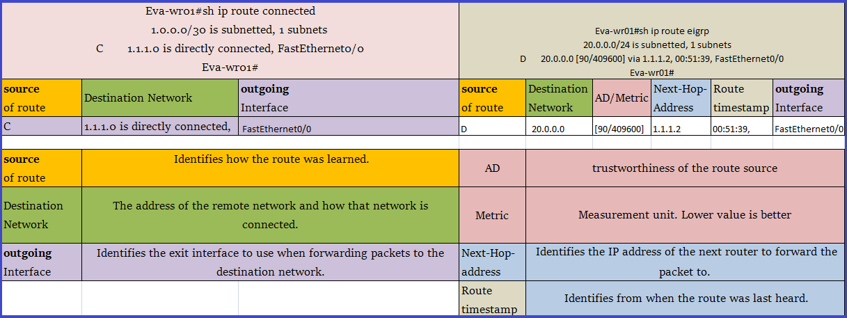 Routing Table: Routing table stores the route information means routing table have information about all the networks (directly connected / dynamically learnt / statically configured). A routing table is act like a map for the router. Each router’s routing table is stored in the RAM of the device.