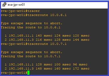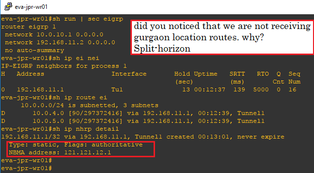 After enabling routing we can see that routers are exchanging routes with each other but eva-jpr-wr01 will not receive routes from eva-ggn-wr01 and vice versa due to EIGRP’s split horizon role therefore we have to disable split horizon on Hub location using below commands.