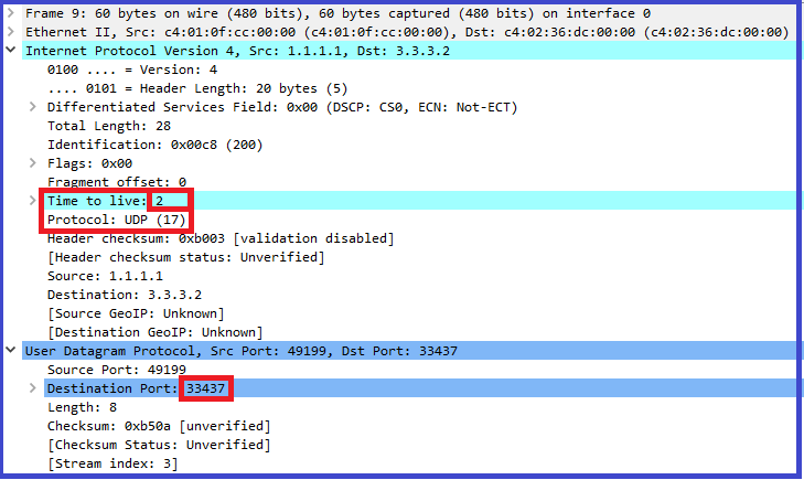 3. Once source device received the 3 ICMP TTL exceeded packets, it will send another 3 UDP packets with a TTL of 2. The same process recurs until the destination is reached.
