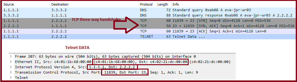 4) Once Source receives the resolved IP address of the destination , it creates a Telnet packet and