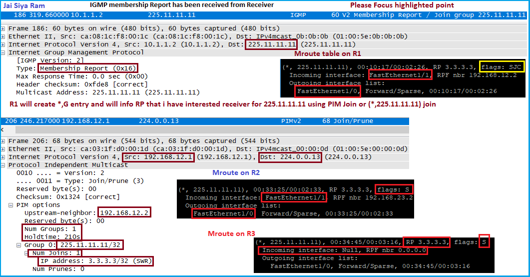 - Intermediate router will create (*,G) entry and update other info like OIL and forward the PIM join towards RP based on unicast route info which can be verified using “show ip rpf <RP-Address>”. Basically PIM join or *,G join is proceed hop-by-hop bases.