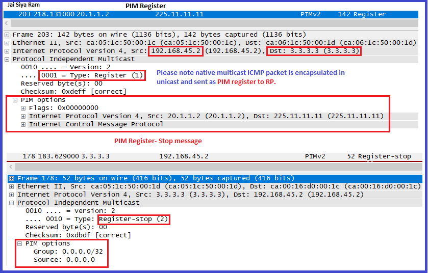 - When R5 receive multicast traffic from Source it will create (S,G and *,G) entry but OIL will be null as no one asked about stream yet. FHR (R5) will send PIM-Register Message to RP which is encapsulated in unicast.
