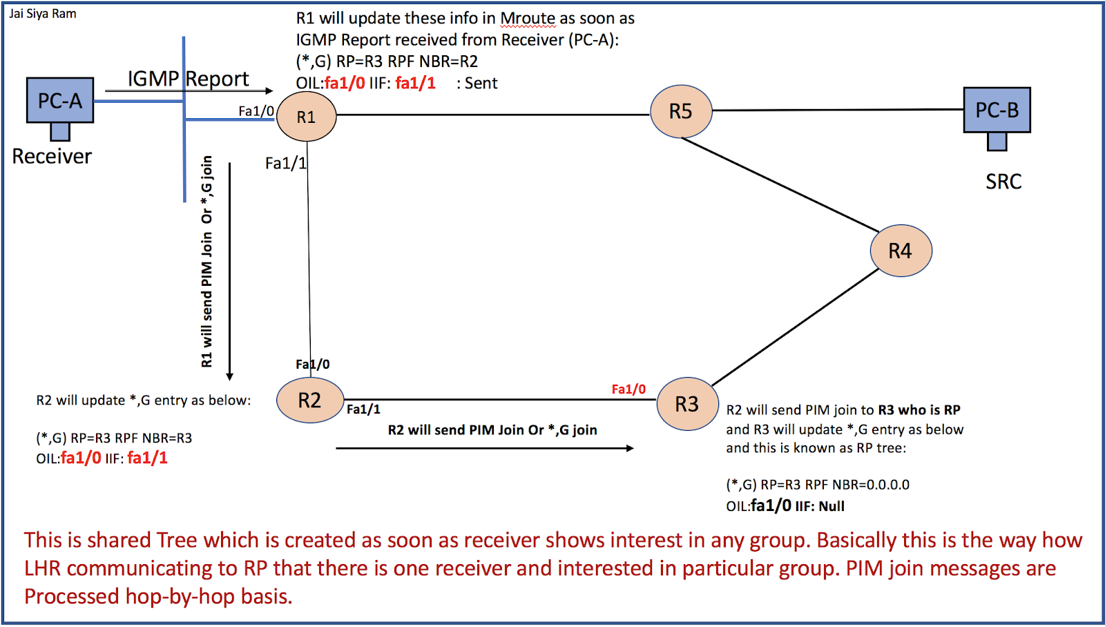 - Receiver will send membership report (saying that i am interested in group G). LHR (R1) will come to know that it has receiver on particular interface. LHR will create (*, G) entry and will update OIL.