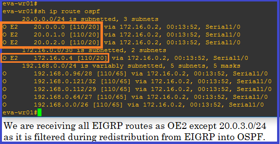 1. Redistribute all route from eigrp to ospf except 20.0.3.0/24.