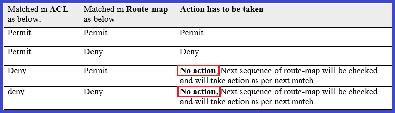 Ø If the route map is applied in the policy routing environments, the packets which don’t meet a match criteria are forwarded based on a routing table.We use the route maps to deny or permit the information is true by match statements. There is an implicit “deny all” at the end of every route-map.