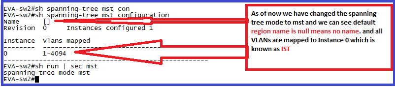 As soon as we configure spanning tree mode as MST then it will take default region name as “Null” basically means no name . By default MST creates Instance 0 and all VLANSs are mapped to instance 0 .