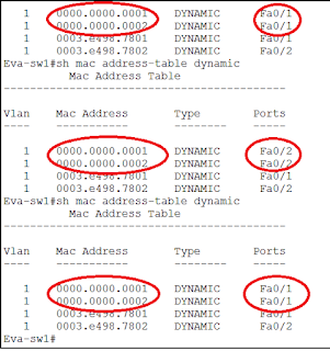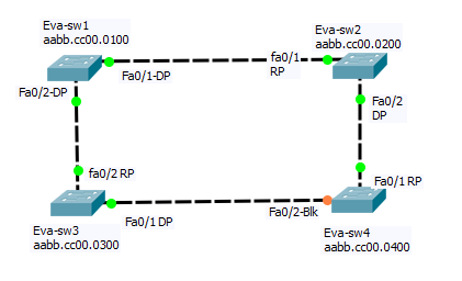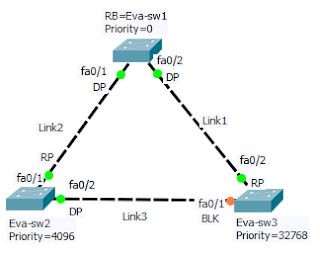 Because Eva-sw1 has lower bridge id as all switch has same priority but eva-sw1 has lower MAC address so it’s selected as Root Bridge as mention in root bridge election process. All port will be in forwarding state at RB.