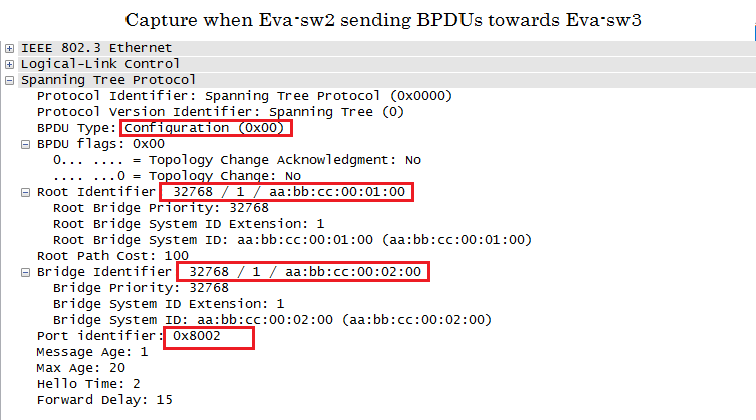 - Eva-sw2 receives the better BPDU from Eva-sw3 and considers now the ports that lead to Eva-sw3 as its root port.