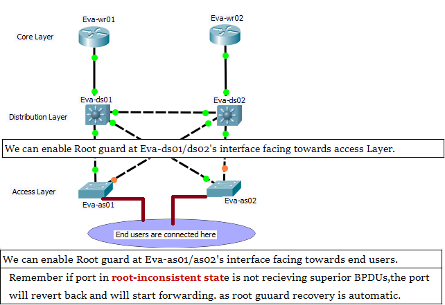 ** Root Guard enable port can forward and relay bpdu’s but can’t become Root. Enable switch port that we don’t want to be root.