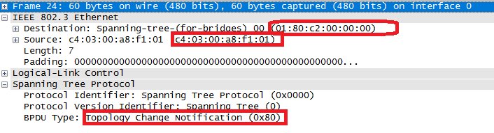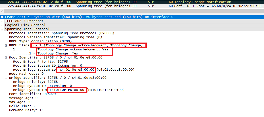 2. Once BPDUs are exchanged between switches they will do election based better bridge id and starts advertising this new Root bridge id in its BPDUs. Let’s see the capture
