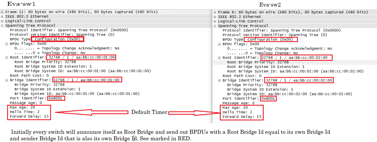 1. Initially every switch will announce itself as root bridge and send out BPDUs with a root bridge id equal to its own bridge id and sender bridge id that is also its own bridge id.