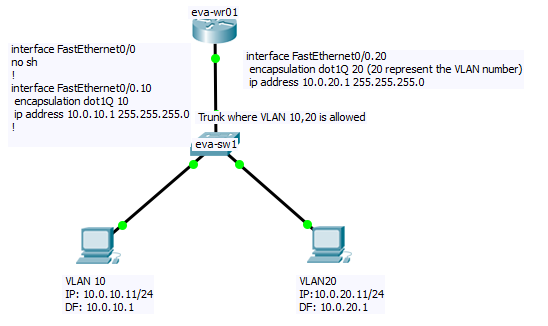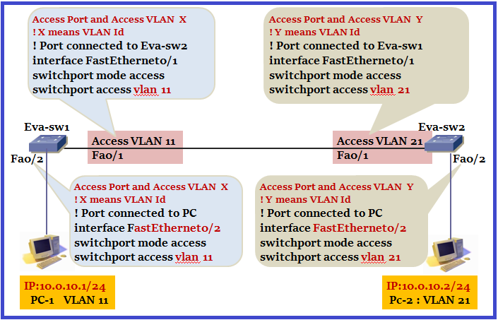 Let’s have a look in communication. When Eva-sw1 receives frame from PC then it sends PC1’s frame over the link with tag . Tag have information about the VLAN from which PC belongs in our example VLAN11. When it gets to Eva-sw2, it’ll look at that tag and ensure the frame is not sent out any access port that is not in VLAN 11. So communication will not happen.