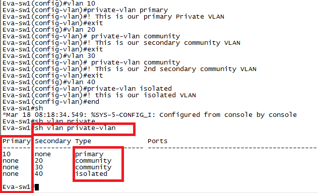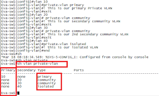 1. Create Primary and Secondary VLAN and associate them with  Private VLAN using following commands:-