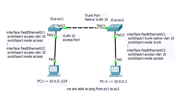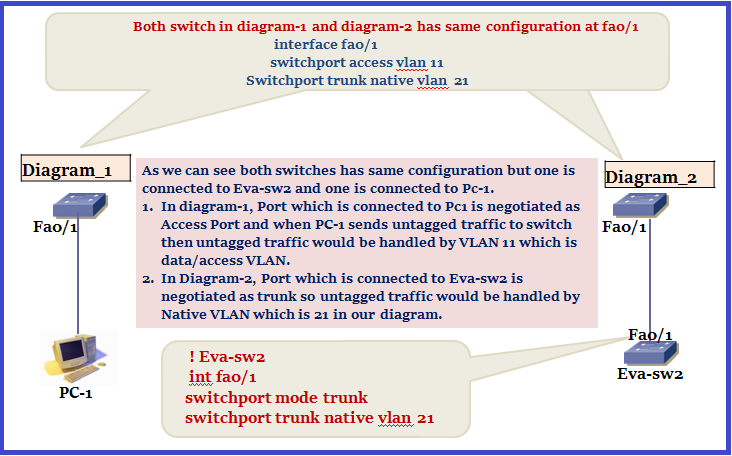 In real environment, we use the same native VLAN both sides of the trunk.  But to understand native VLAN we designed like this. When Eva-sw1 receives traffic from PC-1 then eva-sw1 will send data untagged towards Eva-sw2. Why? Because PC-1 belongs from VLAN 11 which is Native VLAN in our design. When Eva-sw2 receives un-tagged frame then Eva-sw2 will send it to Native VLAN which is VLAN 21 in our design. Here the catch is we are leaking traffic from VLAN 11 to VLAN 21.