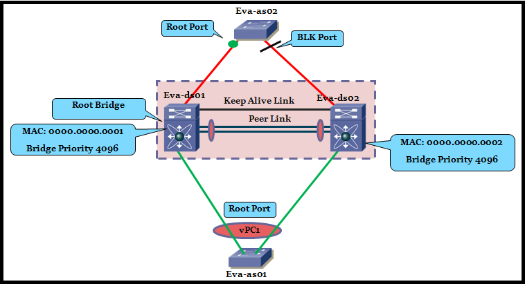 vPC Primary and secondary generates BPDUs with root bridge id set to virtual bridge id and designated bridge set to physical bridge idIn our diagram Eva-as02 will block one link which is connected to Eva-ds02 ( Higher Physical Bridge id).