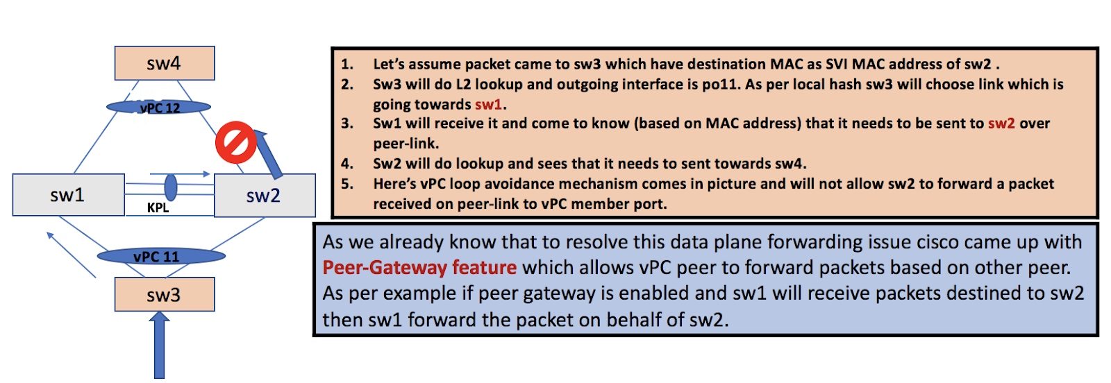 Data Plane issue : As we know that Loop Avoidance Rule for Traffic over Peer Link – Data Traffic received on the peer link cannot be forwarded and routed on a vPC. Here’s the example which we discussed earlier as well.